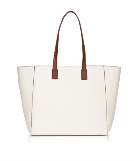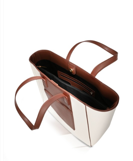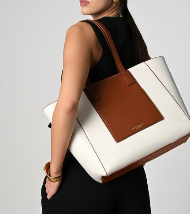 White colourblocked tote bag 3 main compartments, has a button closure, 1 external pocket, 2 inner pockets