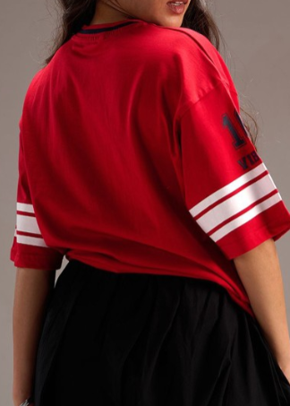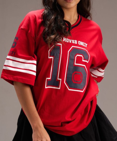 Elevate your casual wardrobe with the Oversize No. 16 Varsity T-Shirt, a perfect blend of sporty and chic. Featuring a relaxed, oversized silhouette, this tee offers all-day comfort with a touch of athletic flair. The bold “No. 16” graphic on the front channels classic varsity vibes, while the soft, breathable fabric ensures a laid-back feel. Ideal for layering over leggings, jeans, or shorts, this tee effortlessly transitions from lounging at home to running errands in style. Show off your sporty side with this must-have piece that combines comfort with a cool, collegiate aesthetic. Fit: Oversize Length: Long Material: Cotton Jersey Additional detail: Drop shoulder with elbow length sleeve, contrasting neck rib and print in front and on the sleeve.
